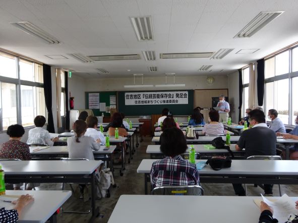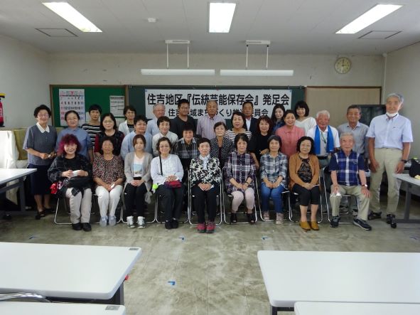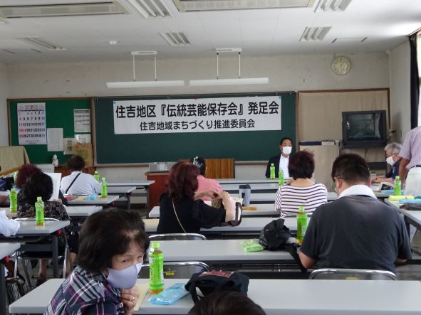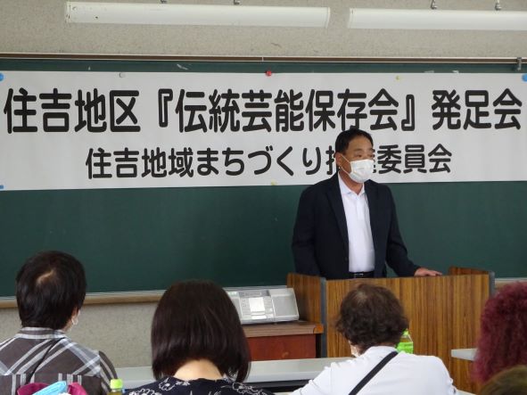 昨年より住吉地区伝統芸能保存会の発足に向けて、実行委員の皆さんは7回の会義を経て30名程度の会員を募ることができました。本日は、会員の皆さんを含め地域再生活動部会の皆さんも参加していただき、『住吉地区伝統芸能保存会(日平・俵踊り/麓・奴踊り)』が発足しました。