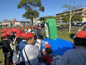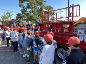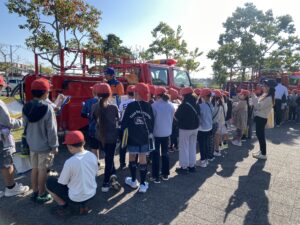 2組に分かれて、防災倉庫と消防車について学びました。