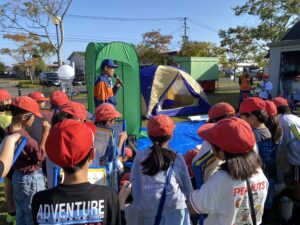 消防車では、住吉消防団の皆さん3台の消防車で応援に来てくれました。 団員さんから直接、車の説明を受けました。