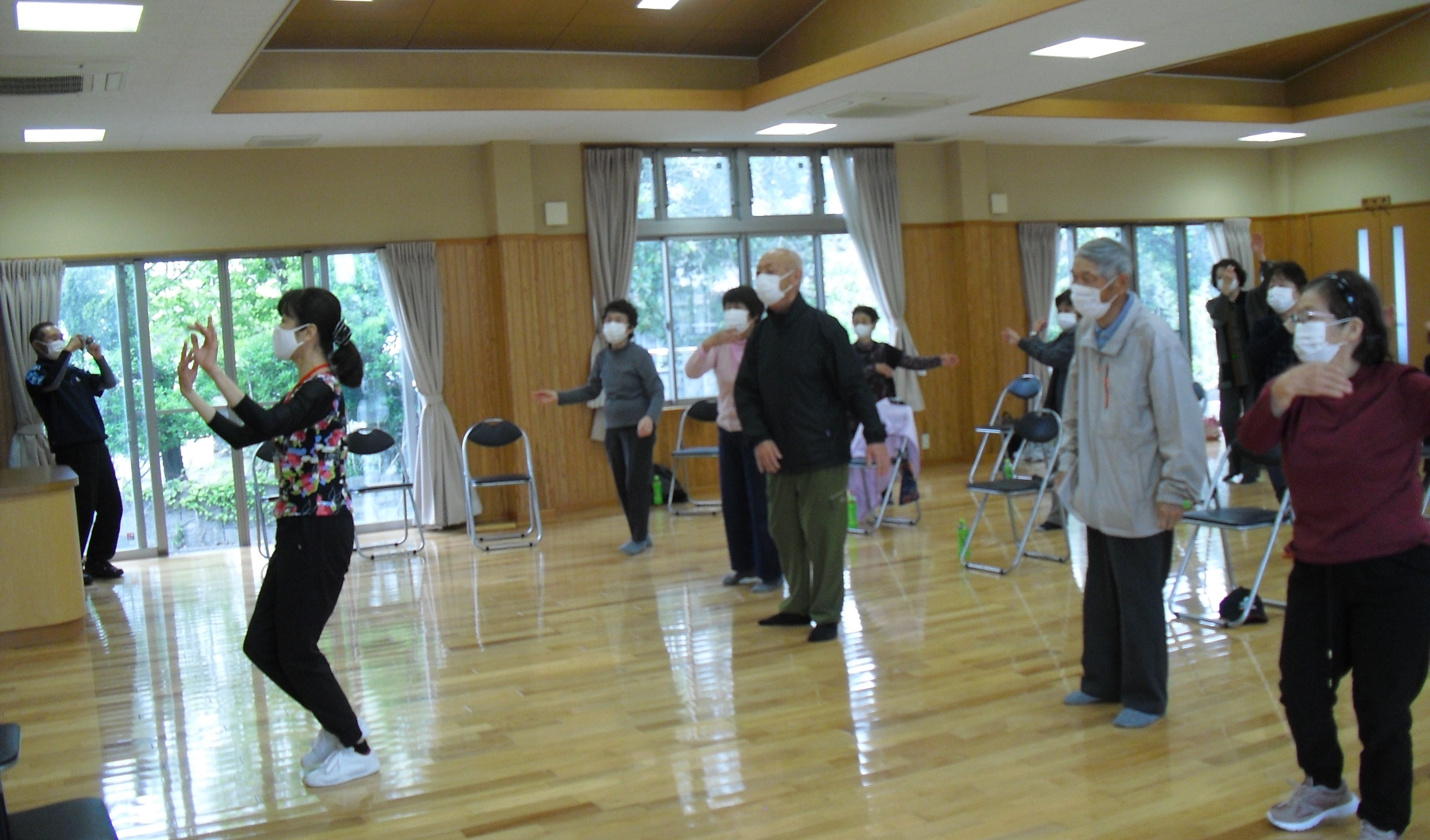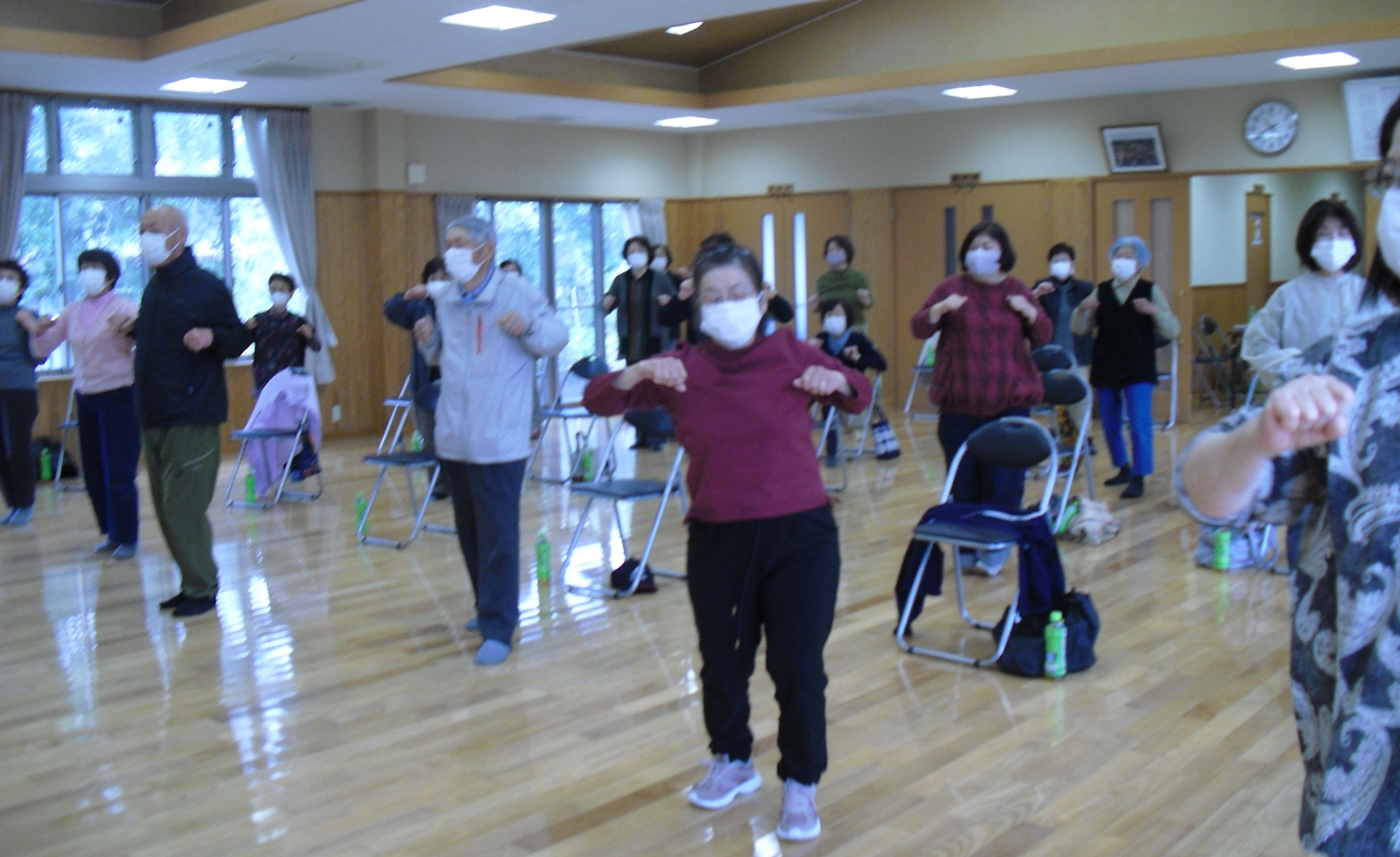 5名の男性を含め29名の皆さんが、指導員のもとで和気あいあいと体を動かし1時間の間楽しく過ごされました。