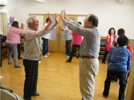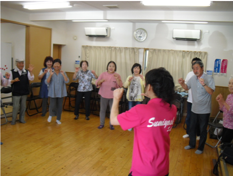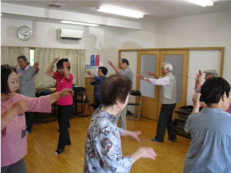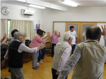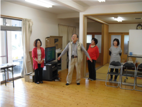 平成30年度の最初の健康体操が元村自治会で実施されました。 福留ひとみ先生を講師に迎え、甲斐自治会長さんをはじめ17名の参加者が和気あいあいに、大笑いしながら体をほぐしました。 365歩のマーチで体操をし、途中休憩をはさんで皆さんのご希望で住吉音頭の練習をしました。