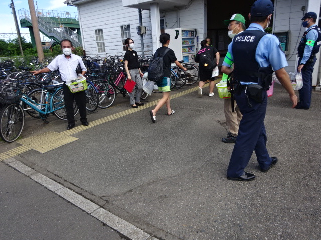 日向住吉駅にて夏の地域安全運動としてJR乗降客に「自転車盗難」「電話による詐欺」「SNSによる犯罪」「大麻の怖さ」等のチラシを配布しました。