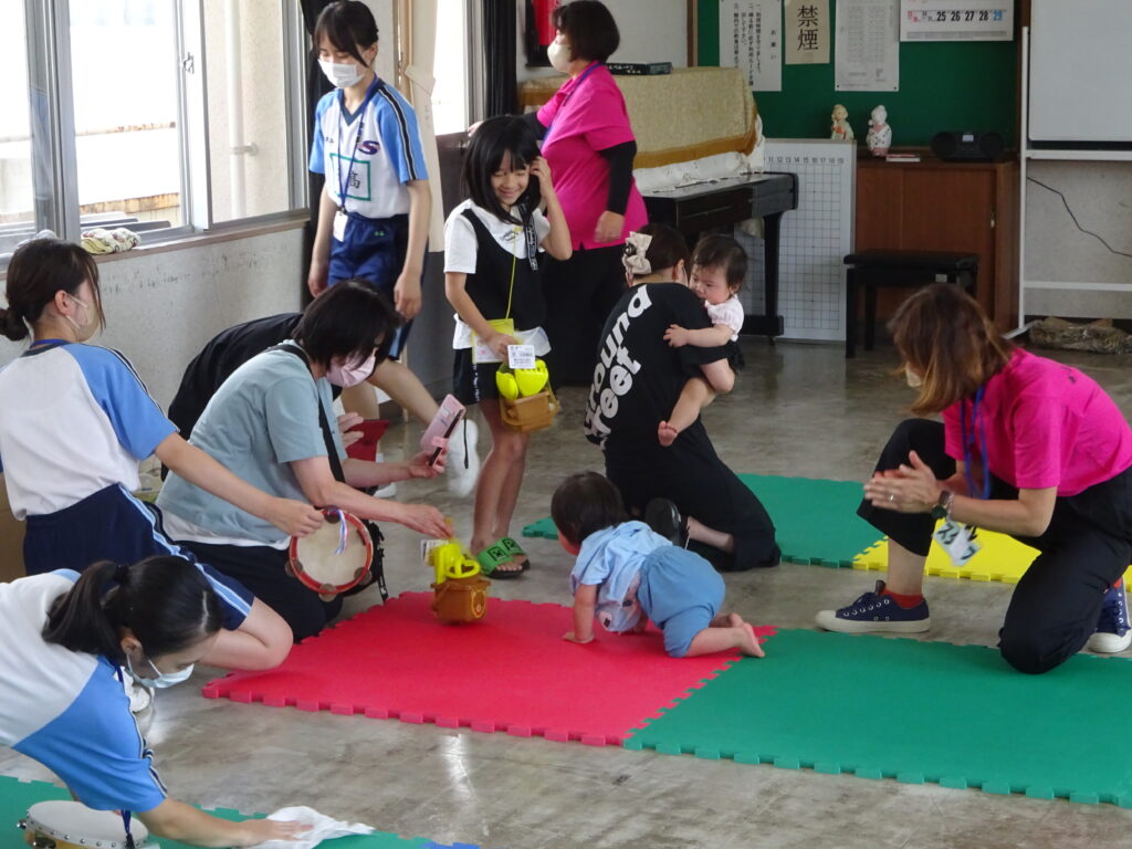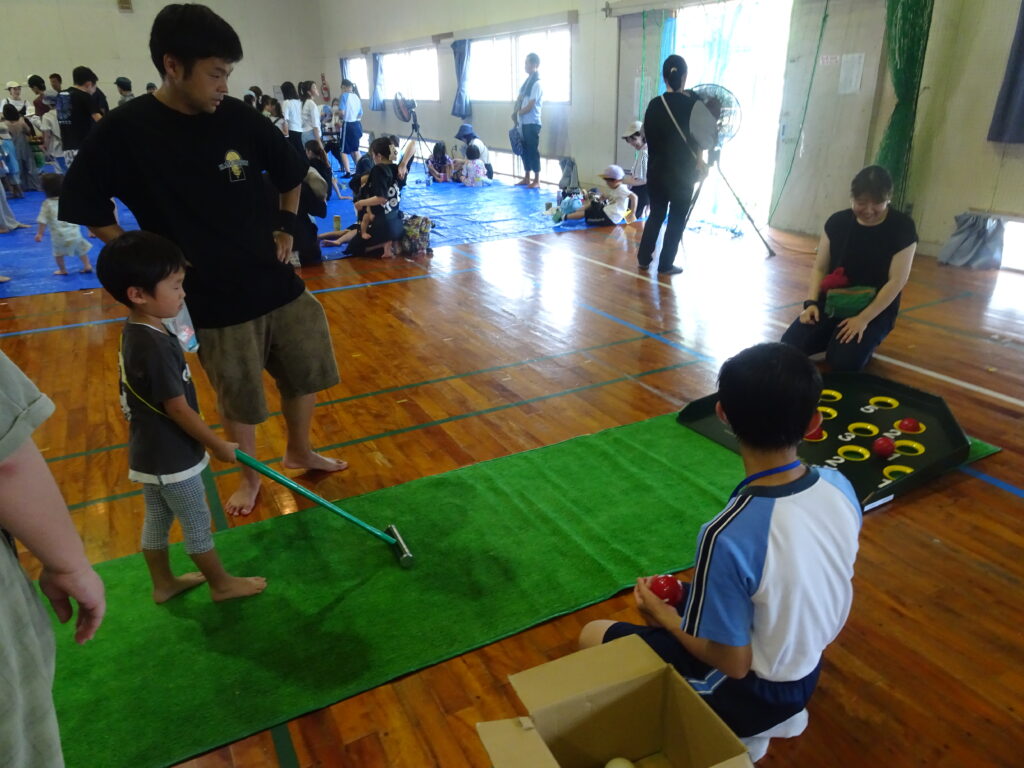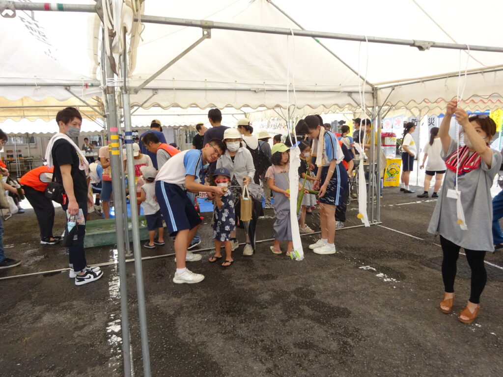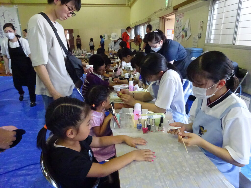 日章学園のトータルエステティック科によるハンドマッサージ・ネイルアート、竹灯篭作り、竹水てっぽう作り、ニュースポーツ体験、ハイハイ競争、絵本の読み聞かせ等のブースが並びました。