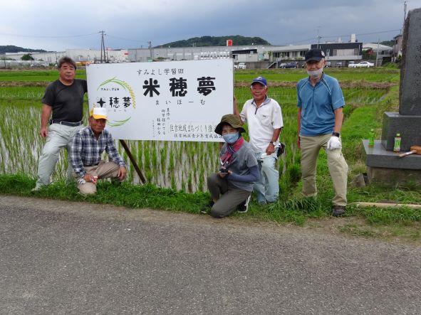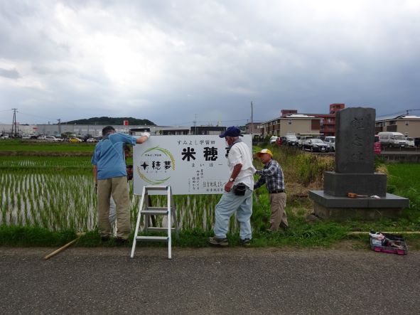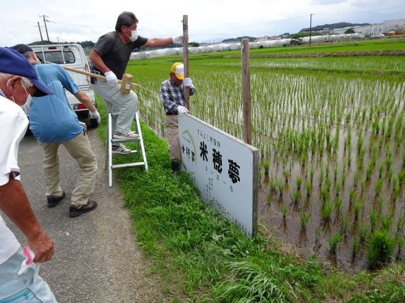 猛暑が続いていましたが、今日は午後から米穂夢の看板を田中副会長と猪野環境保全部会長、環境保全部会員壱岐さんと事務局で立てました。