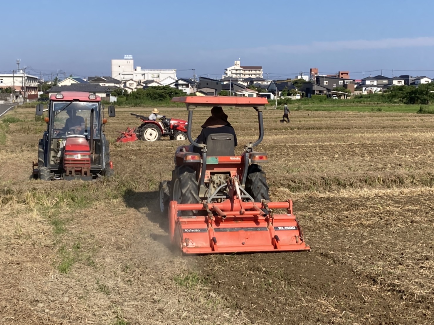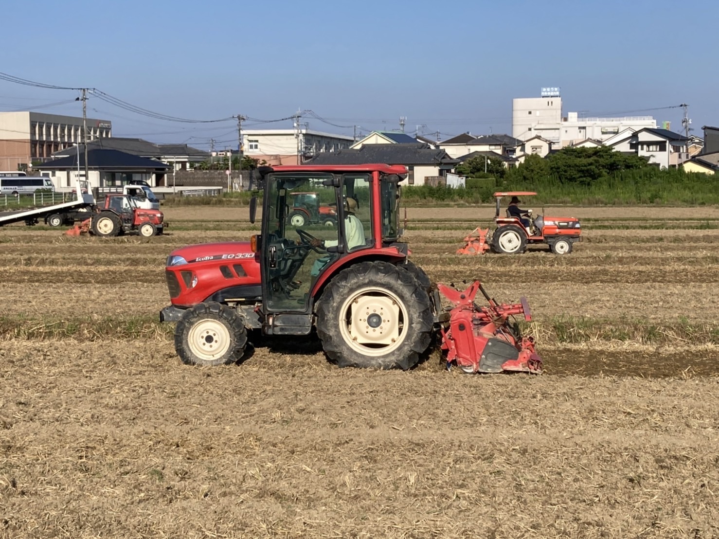 今日は島之内地区の田んぼをトラクター8台で土を耕しました。