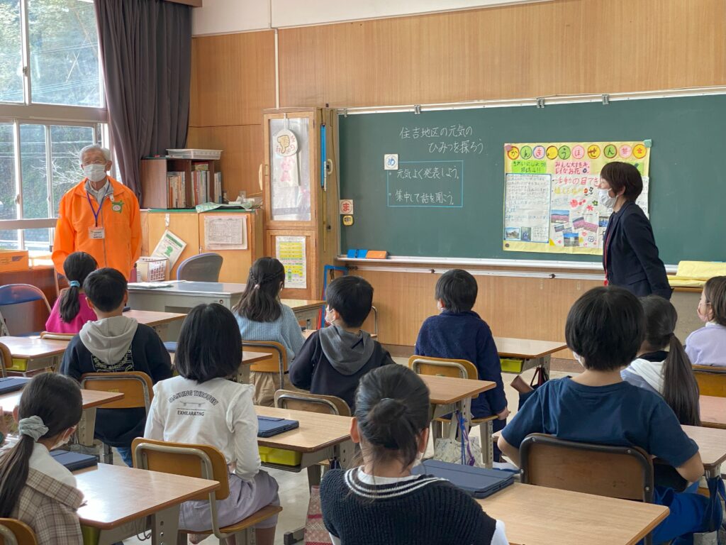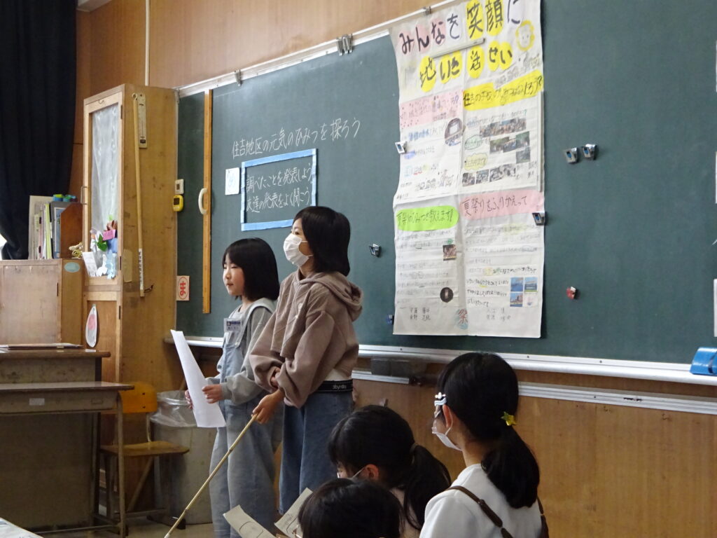 住吉小学校3年生の総合的な学習「住吉地区の元気のひみつを探ろう」の発表会に招かれて出席しました。