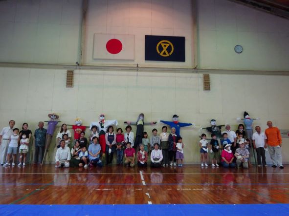 七体の案山子が出来上がりました。力作が勢揃い 皆で記念撮影
