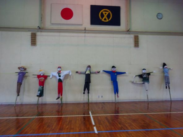 最後に子ども達が顔を仕上げて完成させていました。合わせて7体の案山子ができました。