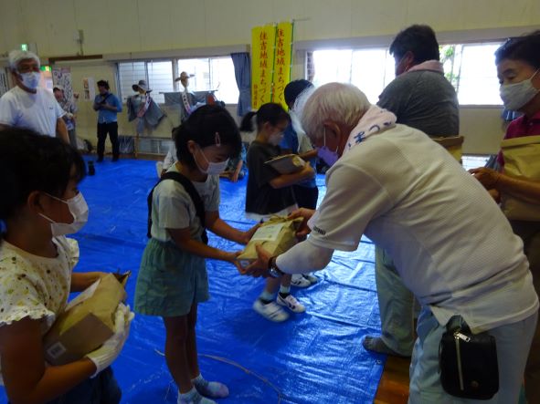 最後に副会長と部会長より参加の子どもさん達に、米穂夢のお米のプレゼントがありました