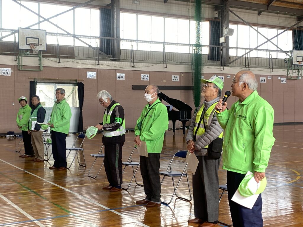 見守り隊を代表して佐藤防犯防災部会長より、 「中学生になっても交通ルールをしっかり守って元気に頑張って!」 と温かいエールを贈りました。